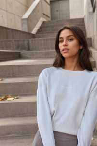 Maglia elasticizzata scritta Maimi, girocollo e maniche lunghe.