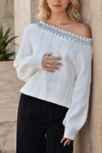 Maglione lavorato con scollo a barca, applicazione gioiello sul collo.