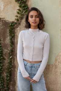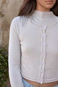 Giacchino lurex elasticizzato, con merletto lavorato, chiusura con bottoni e maniche lunghe.