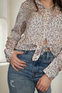 Camicia simil raso con stampa floreale, maniche lunghe, collo revers, chiusura con bottoni.