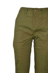 Pantalone con elastico in vita e caviglie, chiusura con bottoni e zip.