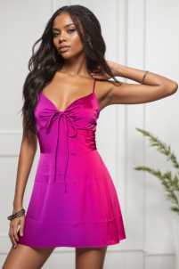 Vestitino simil raso con fiocco, scollo a cuore, bretelle regolabili e chiusura con zip invisibile sul retro.