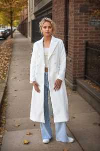 Cappotto lungo con collo revers, maniche lunghe, chiusura con bottoni e tasche laterali.