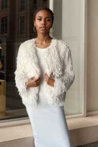 Pelliccia pelo piumata a girocollo, maniche lunghe e chiusura con Clip.