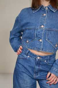 Giubbino di jeans over crop compleo Silvia, design a cinque tasche, chiusura con bottoni.